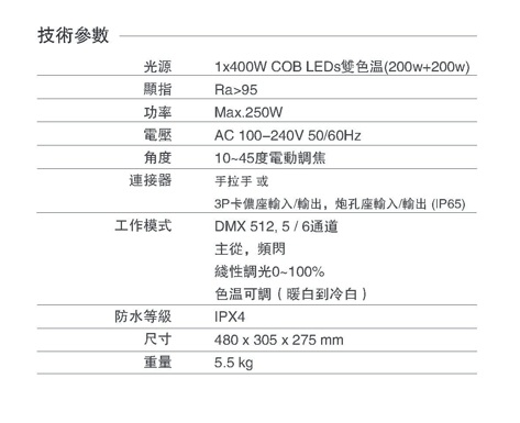 • 每種顏色均可以保持恆定200W的光輸出,並具有2700-6500K色溫調節